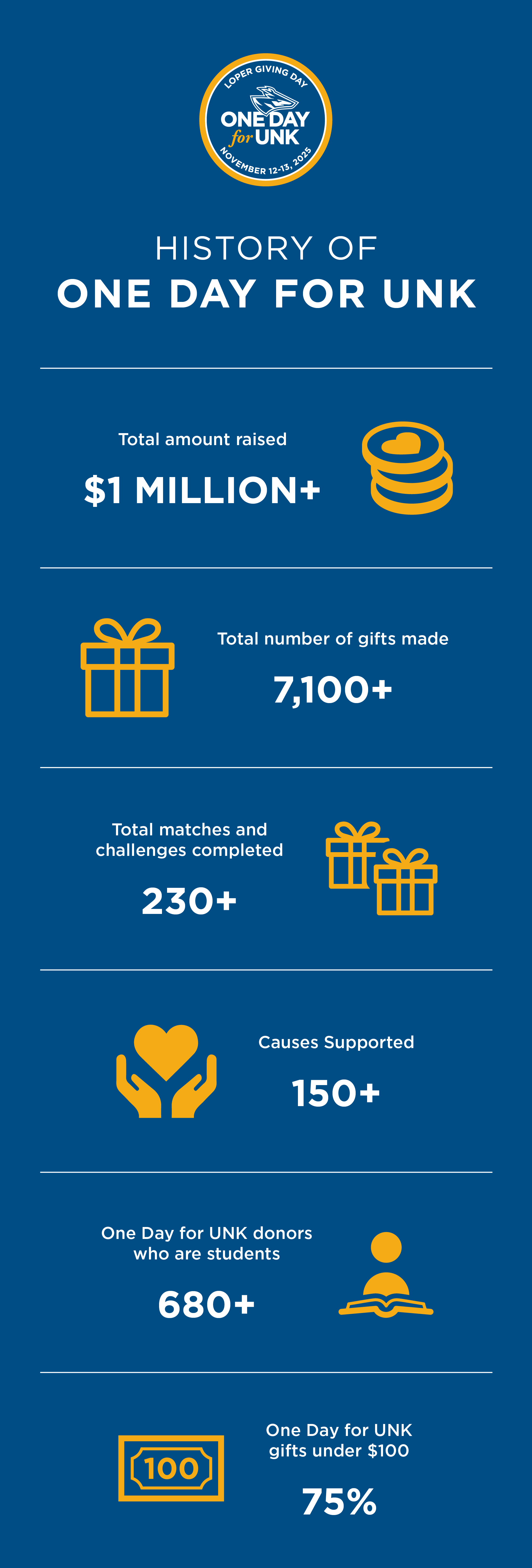 Since 2021, One Day for UNK has been more than just a single-day fundraising event, it’s become a powerful tradition. For four years, the UNK community has united in a shared mission: to lift up students, strengthen campus life and ignite possibilities. Lopers from across the globe — alumni, students, faculty, staff, and friends — have answered the call, proving time and again that every gift creates lasting change. And this year, we celebrate the FIFTH One Day for UNK.